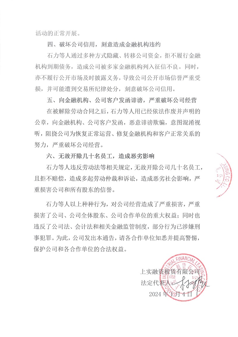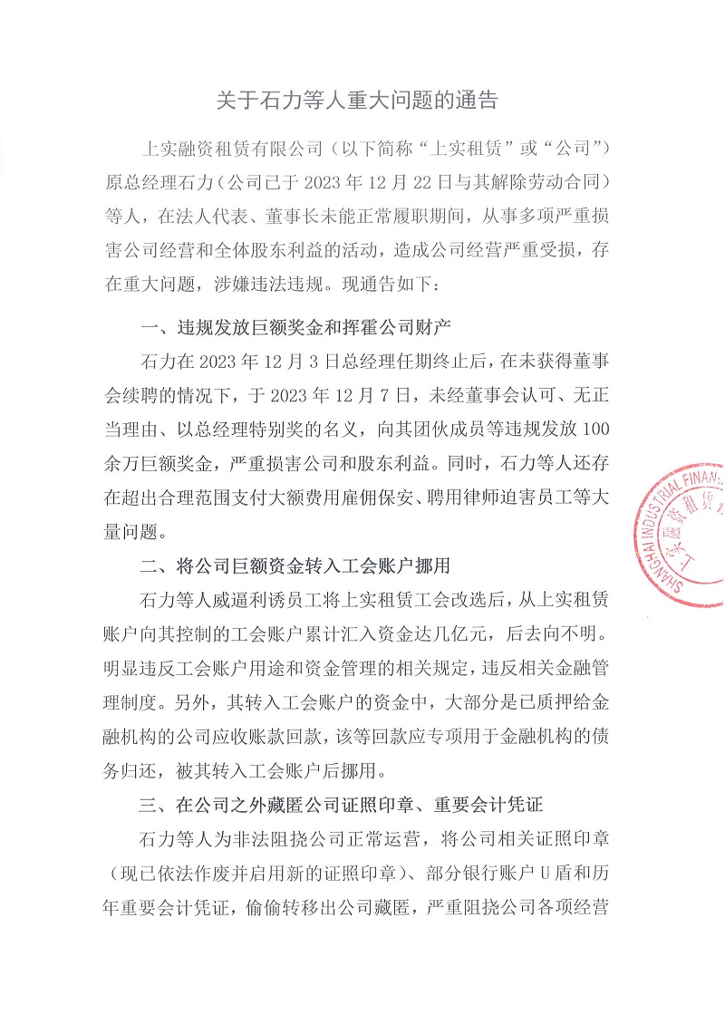 上實融資租賃有限公司(以下簡稱“上實租賃”或“公司”)原總經理石力(公司已于2023年12月22日與其解除勞動合同)等人,在法人代表、董事長未能正常履職期間,從事多項嚴重損害公司經營和全體股東利益的活動,造成公司經營嚴重受損,存在重大問題,涉嫌違法違規(guī)。現(xiàn)通告如下: